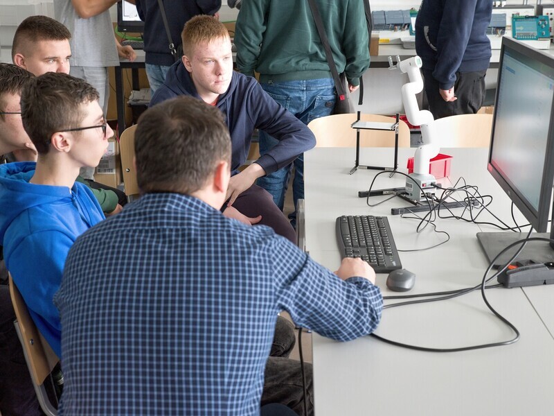 During the classes, Dr. Eng. Łukasz Sobaszek and members of the student scientific club presented the fascinating world of robotics to the students of the Special Technical Secondary School No. 2 in Lublin. The teachers and students had the opportunity to explore three robot stations, gain knowledge of how to control and program them, giving them specific tasks.