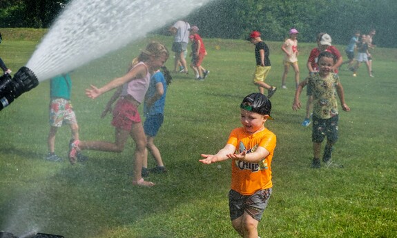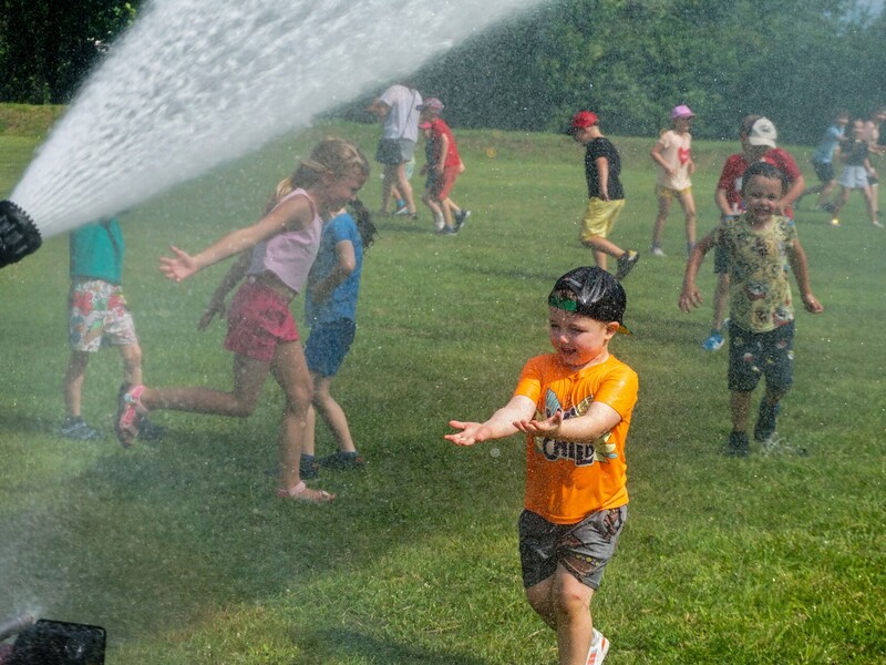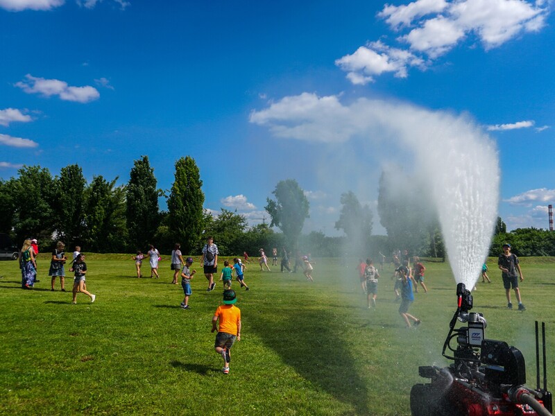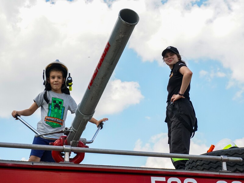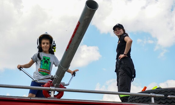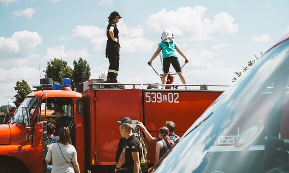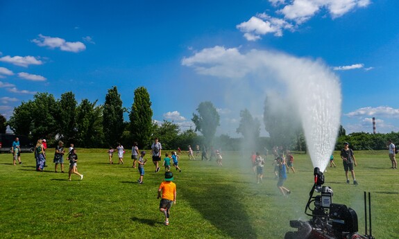 Gabrysia najdłużej bawiła się pod strażackim ”zraszaczem”, a Marysia wolała walczyć na miecze z pianki.