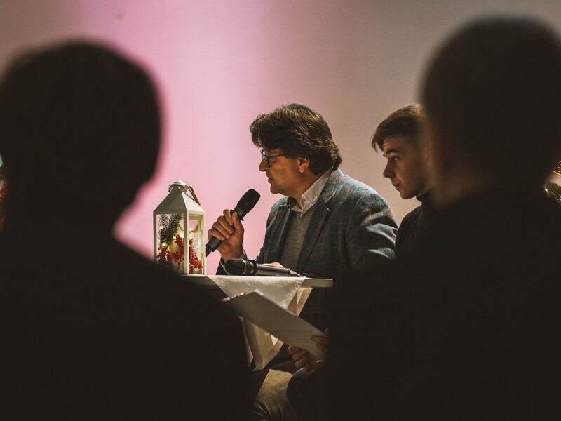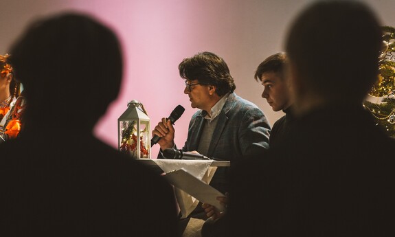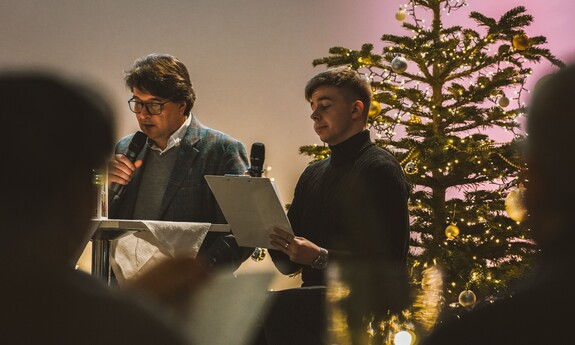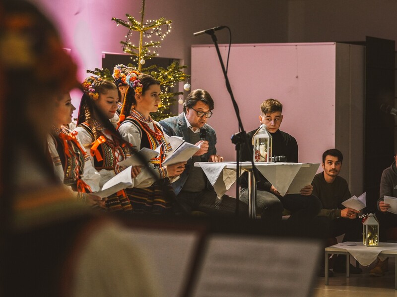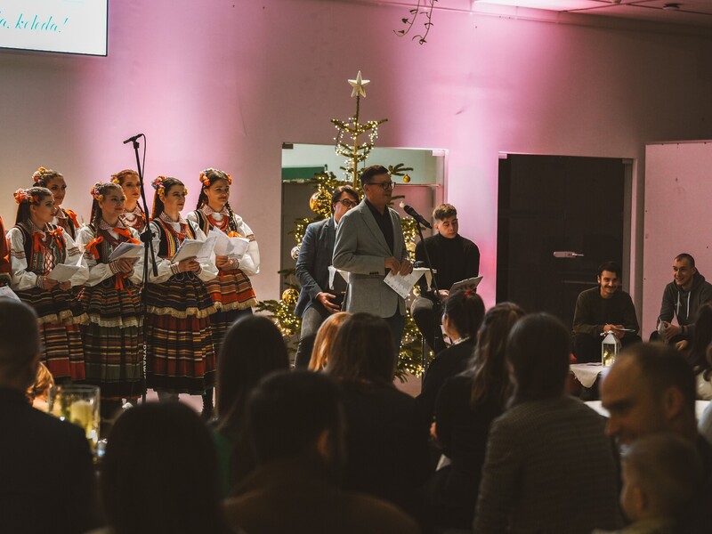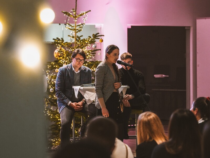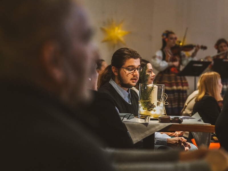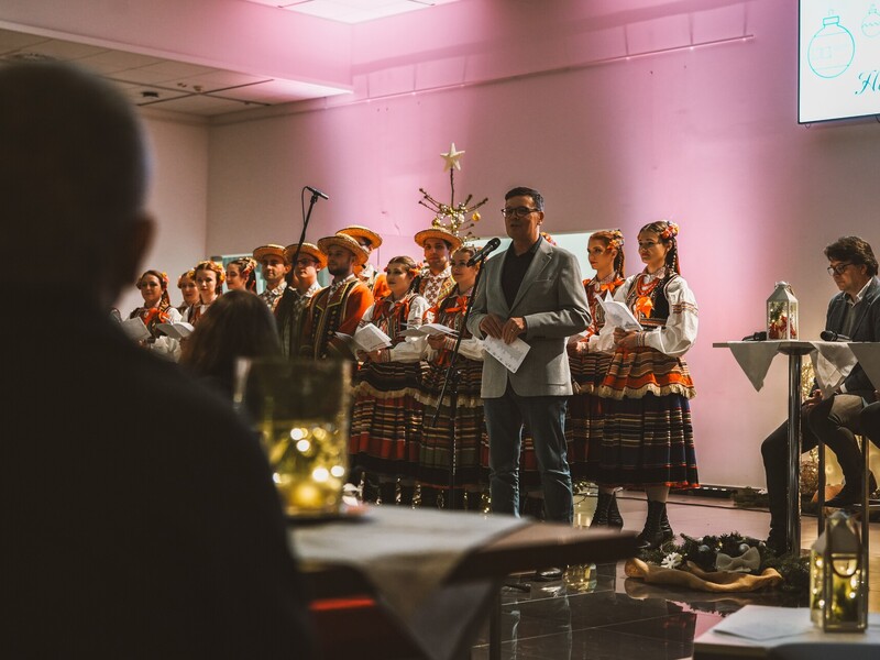 Szymon, student I roku Inżynierii Multimediów, zafascynował wszystkich recytacją wiersza Emilii Waśniowskiej "Wieczór wigilijny". Jego interpretacja wniosła do wieczoru subtelną i refleksyjną nutę.