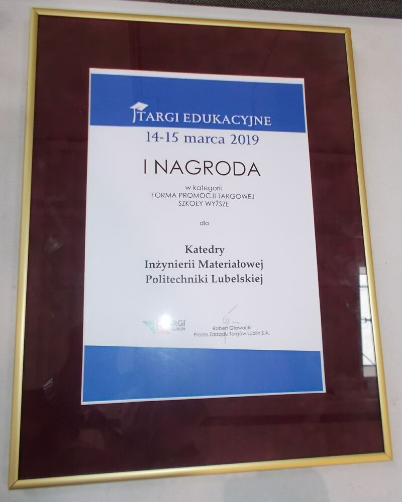 Stoisko Katedry Inżynierii Materiałowej Wydziału Mechanicznego Politechniki Lubelskiej dostało I Nagrodę w kategorii Forma Promocji Targowej Szkoły Wyższe. Stoisko zostało urządzone przez Studenckie Koło Naukowe Inżynierii Materiałowej od lat wystawiające swoje dzieła w MTL. Na naszym stoisku studenci i pracownicy KIM zachęcali do studiowania w Politechnice Lubelskiej, zwłaszcza na kierunku Inżynieria Materiałowa.