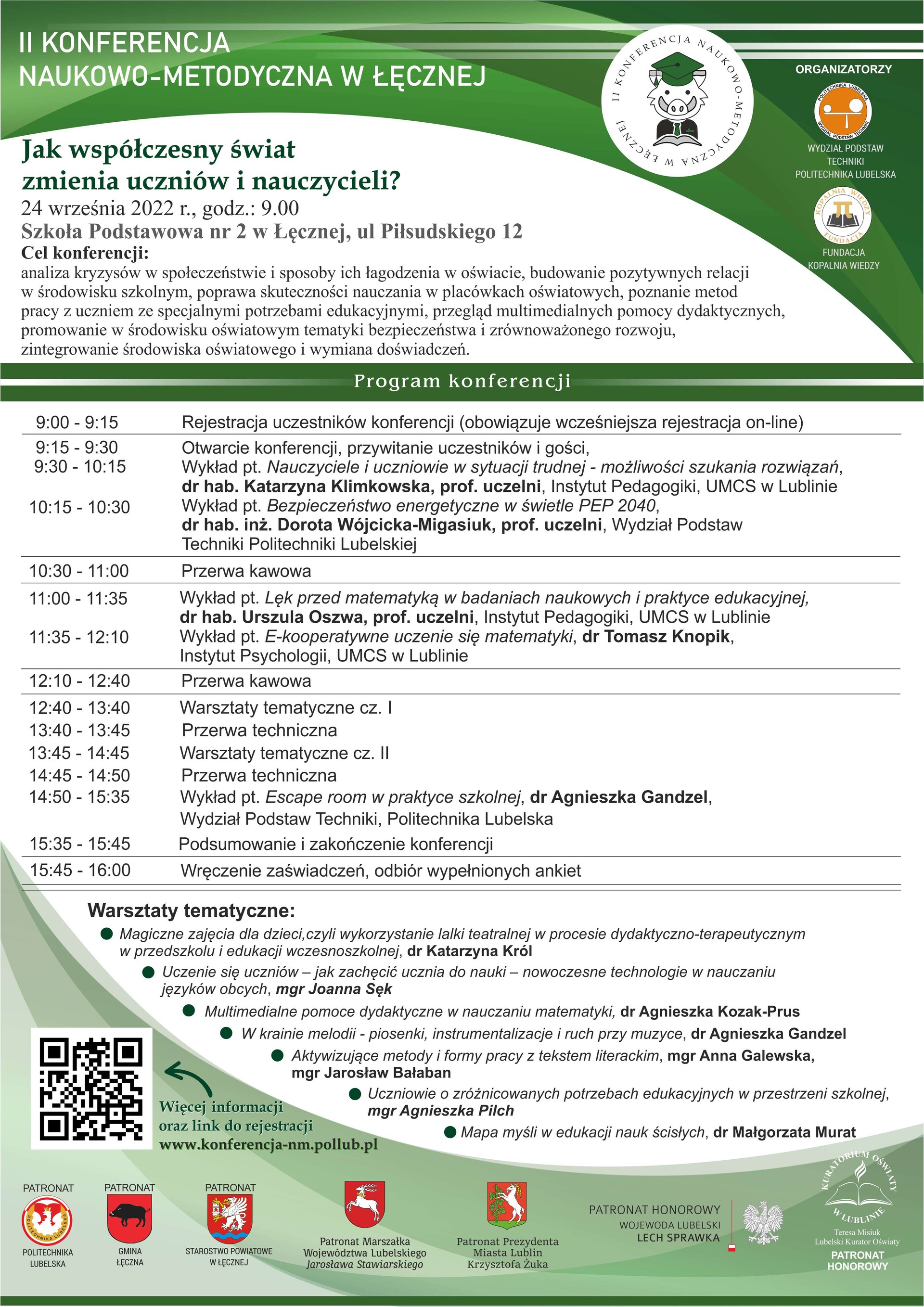 W dniu 24 września 2022 roku w budynku Szkoły Podstawowej nr 2 im. Tadeusza Kościuszki w Łęcznej przy ul. Marszałka Piłsudskiego 12 odbędzie się II KONFERENCJA NAUKOWO-METODYCZNA W ŁĘCZNEJ zatytułowana „Jak współczesny świat zmienia uczniów i nauczycieli?” Organizatorami konferencji są Wydział Podstaw Techniki Politechniki Lubelskiej oraz Fundacja Kopalnia Wiedzy z Łęcznej.