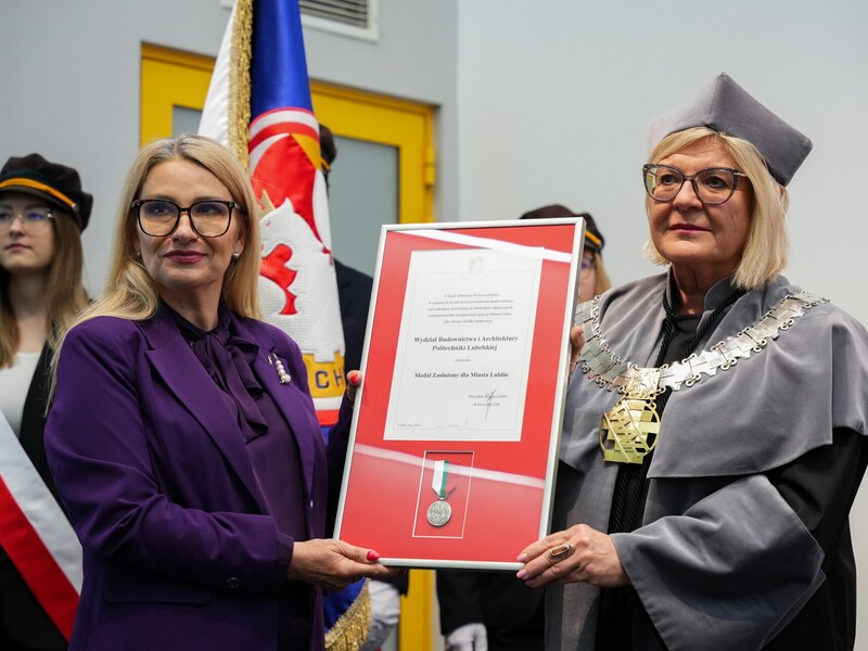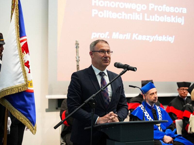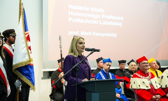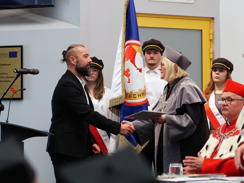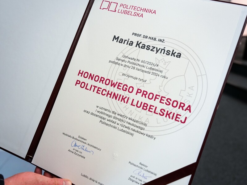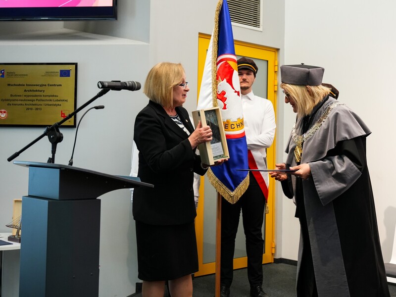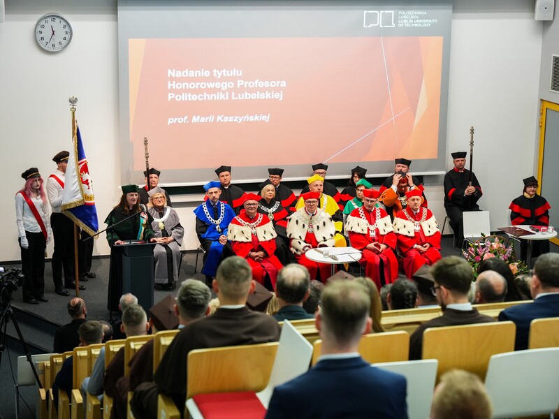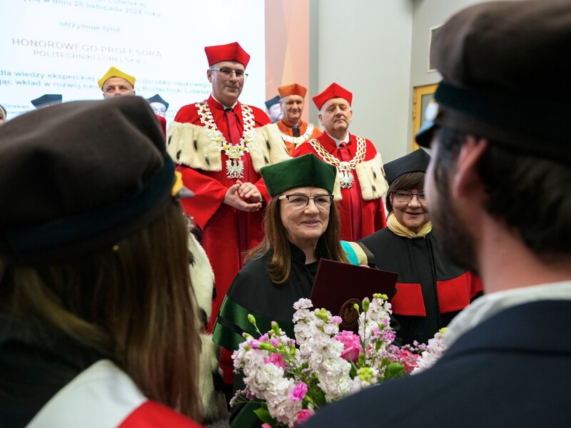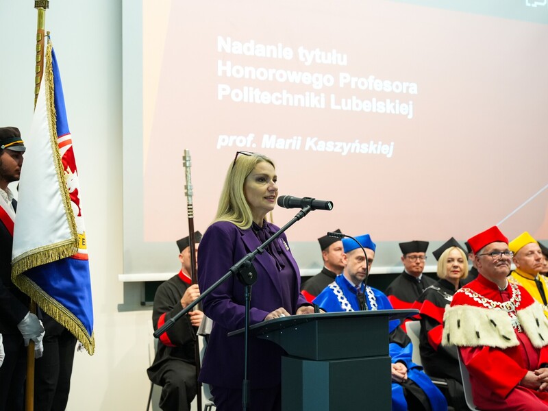 Podczas uroczystości nadano tytuł Honorowego Profesora Politechniki Lubelskiej prof. dr hab. inż. Marii Kaszyńskiej z Zachodniopomorskiego Uniwersytetu Technologicznego, ekspertce od betonów nowej generacji, w tym druku 3D z betonu.