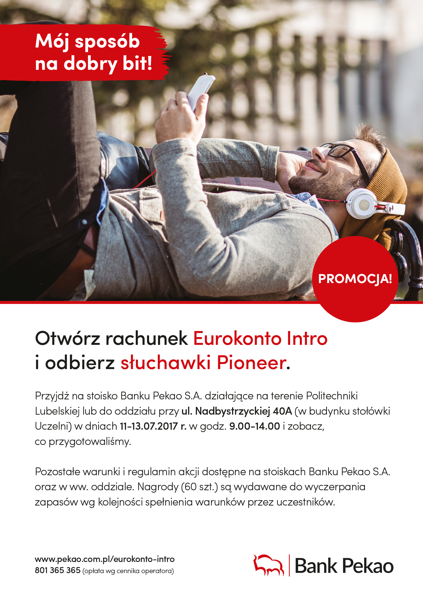 Bank Pekao SA, Partner Biznesowy Politechniki Lubelskiej, posiadający Placówkę w budynku Stołówki przy ul. Nadbystrzyckiej 40A, składa serdeczne gratulacje nowo przyjętym studentom Politechniki Lubelskiej.