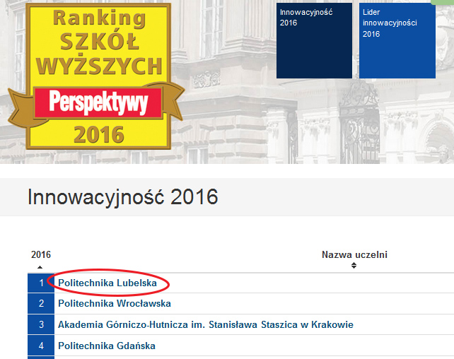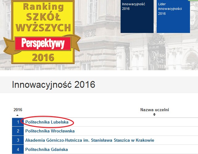 Z dumą ogłaszamy, iż Politechnika Lubelska zajęła pierwsze miejsce w kraju pod względem innowacyjności!