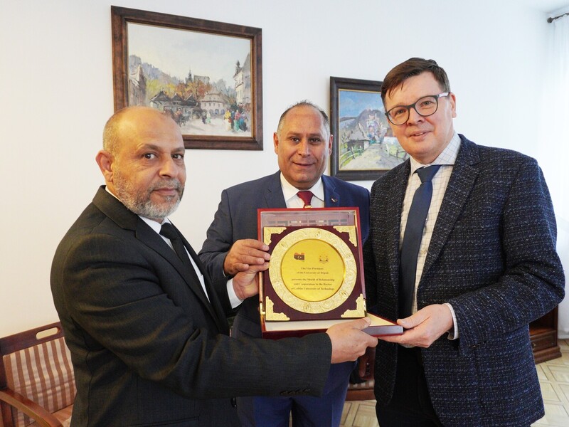 12 grudnia 2022 r. odbyło się spotkanie rektora Politechniki Lubelskiej prof. dr. hab. inż. Zbigniewa Patera z delegacją Uniwersytetu w Trypolisie, na czele z wicerektorem prof. dr. Khalidem G. Alkhubouli i prof. dr. inż. Hakimem S. Abdelgaderem z Wydziału Inżynierii. Podczas tego wydarzenia doszło do podpisania Memorandum porozumienia pomiędzy uczelniami. Rektor Politechniki Lubelskiej otrzymał od swych gości pamiątkową złotą Tarczę Współpracy.