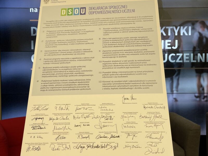 Podczas spotkania przedstawiciele szkół wyższych podpisali Deklarację Społecznej Odpowiedzialności Uczelni. Do grona sygnatariuszy Deklaracji SOU dołączyło kolejnych 78 uczelni z całej Polski, w tym Politechnika Lubelska. W imieniu Uczelni dokument podpisał prorektor ds. studenckich prof. Paweł Droździel. Łączna liczba sygnatariuszy wynosi aktualnie 161 uczelni.