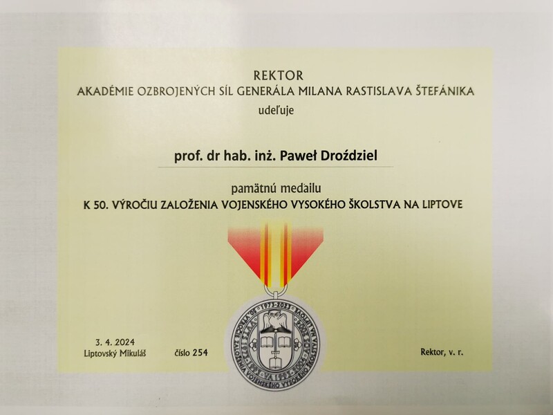 W uznaniu dotychczasowej współpracy naukowej oraz zaangażowania w organizację międzynarodowych konferencji na temat degradacji systemów technicznych, profesor Paweł Droździel, prorektor ds. studenckich Politechniki Lubelskiej, został uhonorowany medalem 50-lecia założenia wyższego szkolnictwa wojskowego na Liptowie. Wyróżnienie to zostało przyznane przez Akademię Sił Zbrojnych generała Milana Rastislava Štefánika w Liptowskim Mikulaszu.