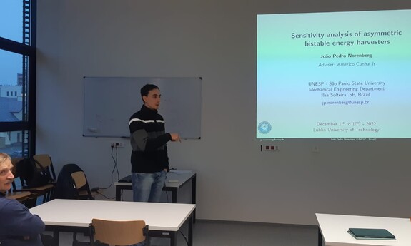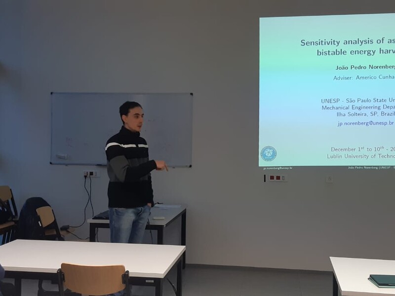 Joao Pedro Norenberg jest doktorantem w São Paulo State University (Ilha Solteira, Brazil). Pod opieką naukową i przy ścisłej współpracy z prof. Grzegorzem Litakiem Joao Pedro Norenberg zbadał wpływ mechanizmu wzmacniającego w nieliniowym systemie przetwarzania energii drgań. Należy podkreślić, iż modelowany układ składa się z rezonatora w postaci belki ferromagnetycznej mocowanej do źródła drgań poprzez dodatkową sprężynę liniową z tłumikiem. Belka porusza się w nieliniowym potencjale podwójnej studni wywołanym oddziaływaniem dwóch magnesów. Przemiana energii mechanicznej na energię elektryczną jest wspierana przez piezoelektryczny element z elektrodami przymocowanymi do obwodu elektrycznego z opornikiem. Wyniki symulacyjne naszego zespołu pokazują, że dodatkowa sprężyna może poprawić pozyskiwanie energii. Zmieniając jego sztywność zaobserwowano różne rozwiązania. W punkcie optymalnej sztywności dodatkowej sprężyny moc wyjściowa wynosi wzmacniane kilka razy w zależności od amplitudy wzbudzenia.