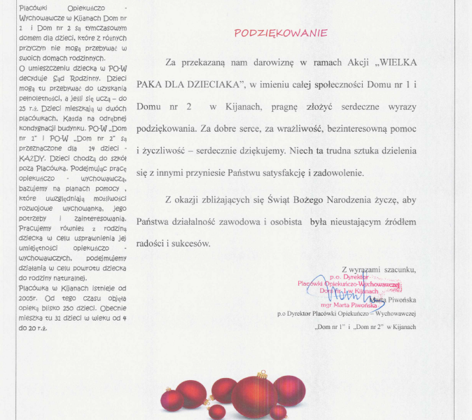 Zebrane dary zostały przekazane 17 grudnia na ręce dyrekcji oraz pracowników domów dziecka w Kijanach.