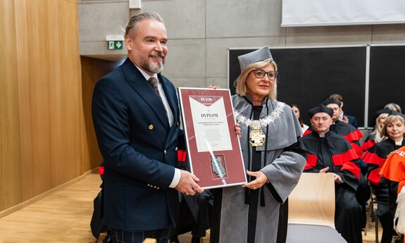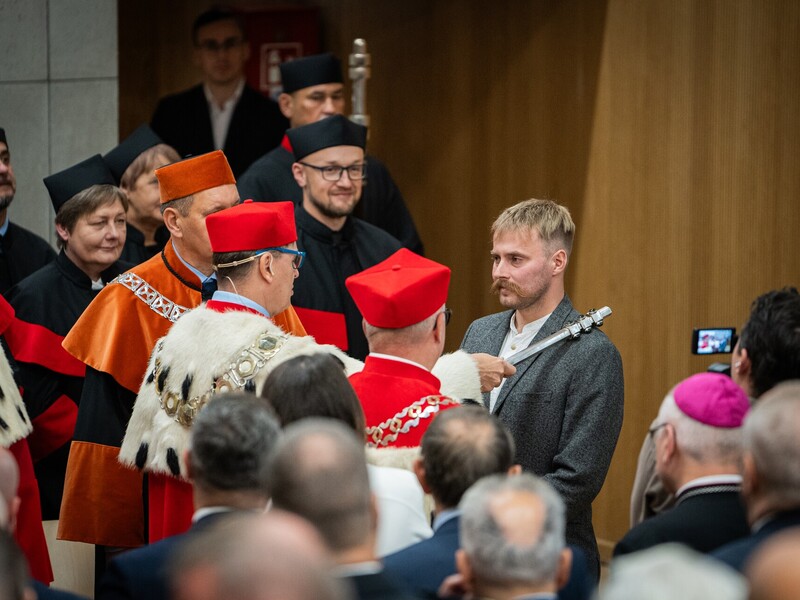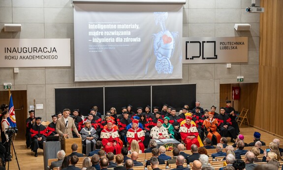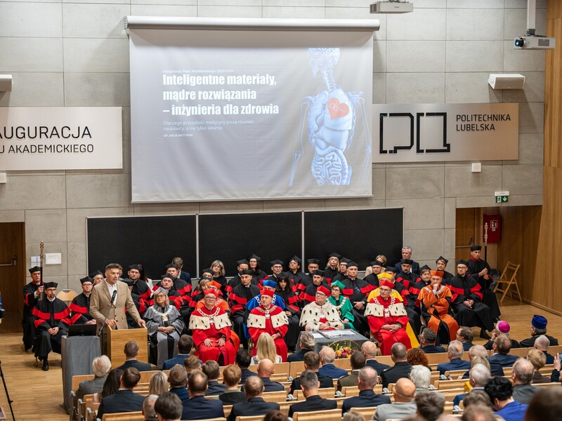Uroczystość zakończył wykład inauguracyjny dra Jakuba Matusiaka z Wydziału Budownictwa i Architektury PL. Naukowiec zwrócił uwagę, że przyszłość medycyny należy do zespołów interdyscyplinarnych. – Medycyna to gra zespołowa, a drużyna składa się z inżynierów, chemików, biologów, biotechnologów oraz specjalistów IT – mówił badacz. W swoim wystąpieniu zaprezentował przykład takiego podejścia – inteligentny implant kostny. – Ten implant nie powstał w gabinecie lekarskim, powstał przy wspólnym stole chemika, biologa i inżyniera – dodał.